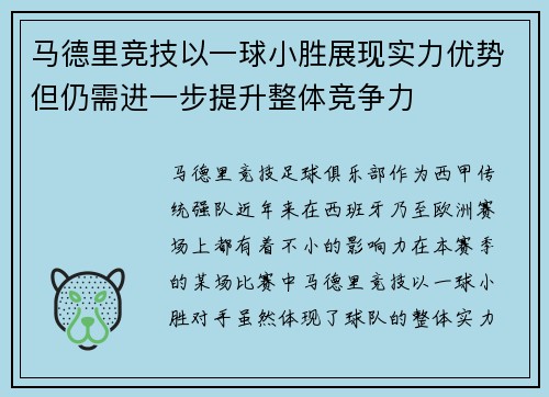 马德里竞技足球俱乐部作为西甲传统强队,近年来在西班牙乃至欧洲赛场上都有着不小的影响力。在本赛季的某场比赛中,马德里竞技以一球小胜对手,虽然体现了球队的整体实力和战术优势,但也暴露出一些仍需改进的地方。本文将围绕“马德里竞技以一球小胜展现实力优势,但仍需进一步提升整体竞争力”这一主题,展开详细分析。文章将从四个方面进行阐述:首先是马德里竞技的防守体系,接着分析球队的进攻效率,再探讨球队阵容深度与替补球员的作用,最后讨论主教练的战术部署和球队的整体竞争力提升路径。通过这四个方面的分析,本文旨在全面解读马德里竞技的现状,并探讨如何在未来进一步提升球队的整体竞争力。