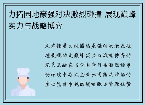 文章摘要:力拓园地豪强对决激烈碰撞,展现的是巅峰实力与战略博弈的完美交融。在当今竞争日益激烈的市场环境中,各大企业如同跨足沙场的勇士,凭借卓越的战略眼光、资源优势与精妙的战术安排,争夺市场的制高点。这...