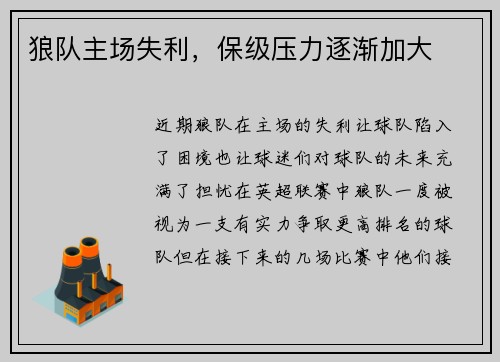 近期,狼队在主场的失利让球队陷入了困境,也让球迷们对球队的未来充满了担忧。在英超联赛中,狼队一度被视为一支有实力争取更高排名的球队,但在接下来的几场比赛中,他们接连在主场失去了至关重要的分数。特别是在...
