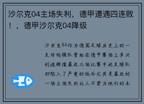 沙尔克04,作为德国足球历史上的一支传统强队,曾经在德甲赛场上多次创造辉煌。最近几场比赛中,这支球队却陷入了严重的低谷,尤其是最近的一场主场失利,让人不禁为他们的未来捏一把汗。在对阵对手时,沙尔克04...