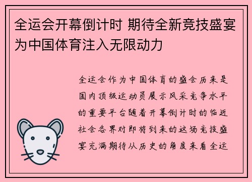 全运会作为中国体育的盛会,历来是国内顶级运动员展示风采、竞争水平的重要平台。随着开幕倒计时的临近,社会各界对即将到来的这场竞技盛宴充满期待。从历史的角度来看,全运会不仅是竞技体育的展示场,更是推动中国...
