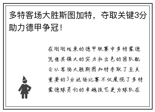 在刚刚结束的德甲联赛中,多特蒙德凭借其强大的实力和出色的团队配合,以客场大胜斯图加特,夺取了至关重要的3分。这场比赛不仅展现了多特蒙德球员们的卓越技艺,更为球队在本赛季的争冠之路上注入了强劲动力。下面...