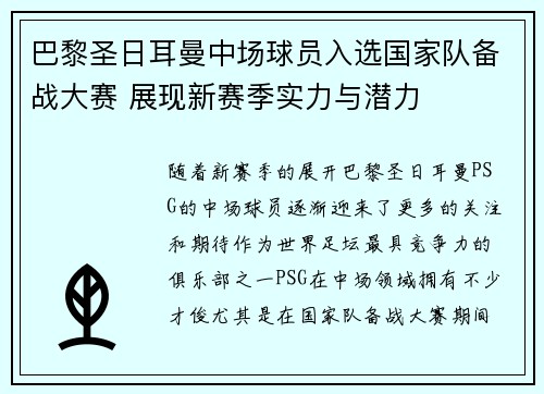 随着新赛季的展开,巴黎圣日耳曼(PSG)的中场球员逐渐迎来了更多的关注和期待。作为世界足坛最具竞争力的俱乐部之一,PSG在中场领域拥有不少才俊。尤其是在国家队备战大赛期间,巴黎圣日耳曼中场球员的表现成...