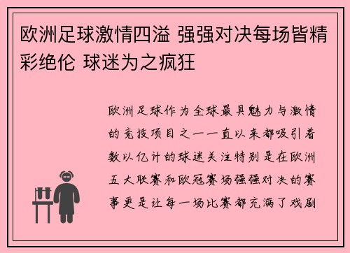 欧洲足球作为全球最具魅力与激情的竞技项目之一,一直以来都吸引着数以亿计的球迷关注。特别是在欧洲五大联赛和欧冠赛场,强强对决的赛事更是让每一场比赛都充满了戏剧性与悬念。这些比赛不仅让球迷们为之疯狂,也让足球的魅力得以淋漓尽致地展现。从球场上的高水平技术对抗,到球队背后的历史恩怨,再到球迷们热情四溢的支持,欧洲足球无时无刻不在上演着激情四溢的强强对决。本文将从四个方面详细分析欧洲足球赛事的激烈程度、精彩表现和球迷的疯狂反应,具体包括:高水平的战术较量、世界级球员的对决、各大俱乐部的历史恩怨、以及球迷文化的独特魅力。通过这四个方面的探讨,我们能够更加全面地了解为什么欧洲足球能够如此吸引球迷,成为全球最具影响力的体育赛事之一。